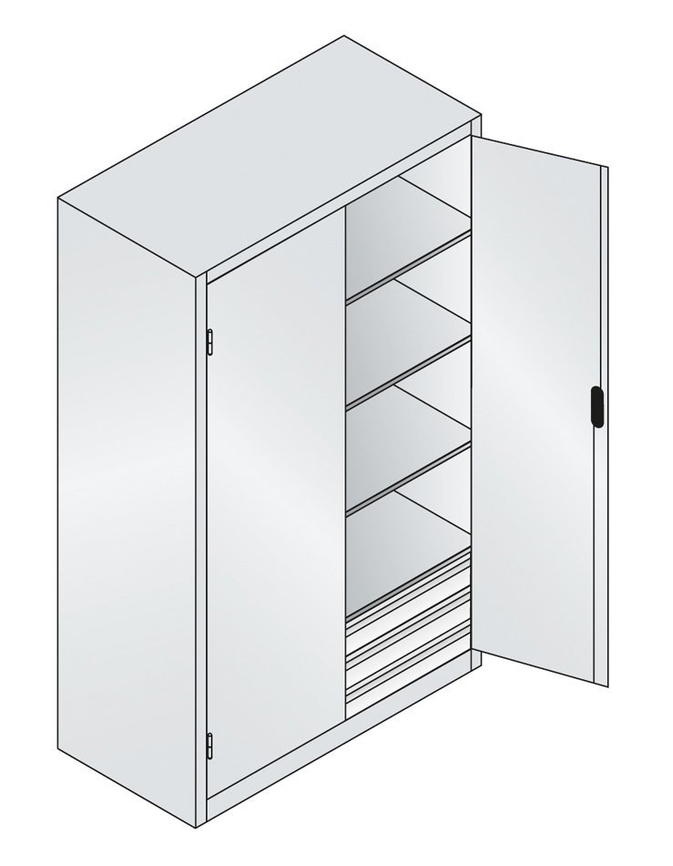 Szafa warsztatowa dwudrzwiowa, szerokość 950, wysokość 1950, głębokość 600 mm, 2 półki, 2 szuflady. Możliwość wymiany drzwi pełnych na drzwi z wypełnieniem szklanym lub drucianym. Kolor korpusu RAL 7035 jasnoszary.
