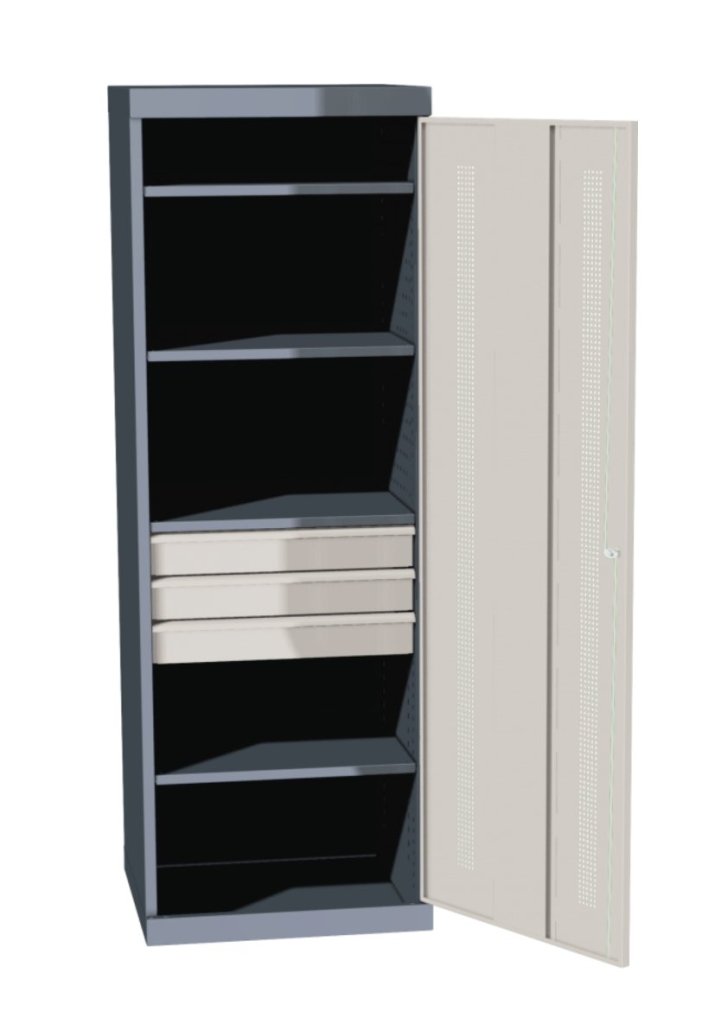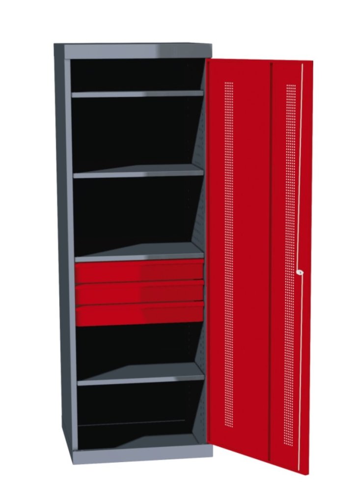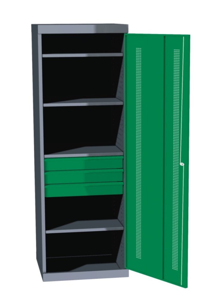 Ekonomiczna jednodrzwiowa szafa warsztatowa. Wysokość 1800 x szerokość 620 x głębokość 600 mm, 4 regulowane półki, 3 szuflady. Kolor korpusu szary RAL 7031, kolor drzwi zielony RAL 6001, niebieski RAL 5012, czerwony RAL 3000, jasnoszary RAL 7035 lub żółty RAL 1023.