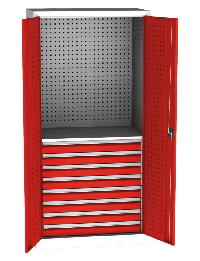 Szafa warsztatowa dwudrzwiowa, szerokość 950, wysokość 1950, głębokość 600 mm, 1 półka, 8 szuflad. Możliwość wymiany drzwi pełnych na drzwi z wypełnieniem szklanym lub drucianym. Kolor korpusu RAL 7035 jasnoszary.