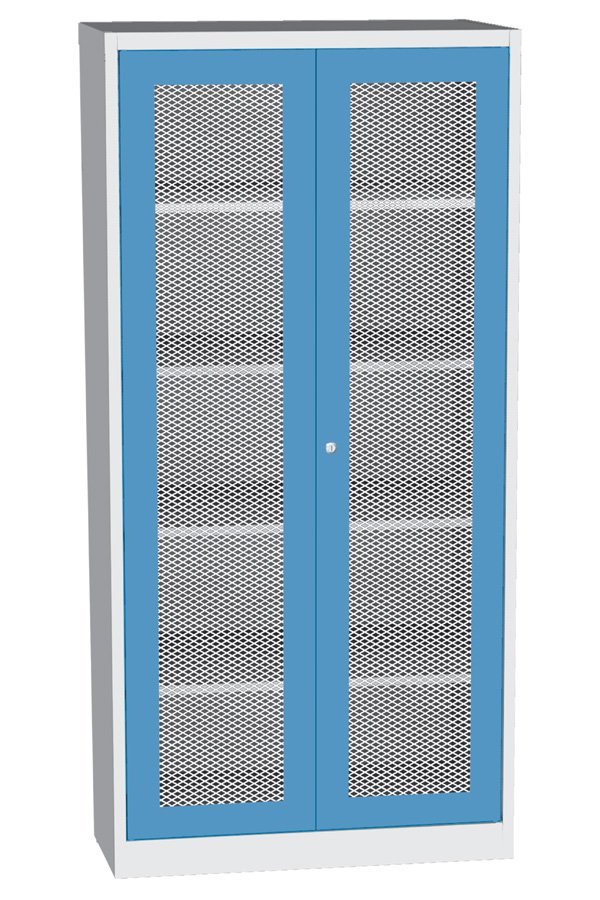 Szafa warsztatowa dwudrzwiowa z drzwiami drucianymi w ramie stalowej, szerokość 950, wysokość 1950, głębokość 600 mm, 4 półki. Nośność korpusu 800 kg, pojemność półki 100 kg. Kolor korpusu RAL 7035 jasnoszary.