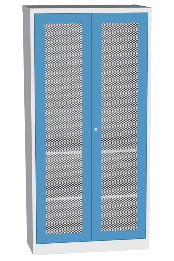 Szafa warsztatowa dwudrzwiowa z drzwiami drucianymi w ramie stalowej, szerokość 950, wysokość 1950, głębokość 600 mm, 2 półki. Kolor korpusu RAL 7035 jasnoszary.