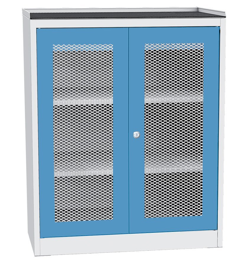 Szafa warsztatowa dwudrzwiowa z drzwiami drucianymi w ramie stalowej, szerokość 950, wysokość 1180, głębokość 600 mm, 2 półki, 1 szuflada. Nośność korpusu 800 kg, pojemność szuflady 50 kg, pojemność półki 100 kg. Kolor korpusu RAL 7035 jasnoszary.