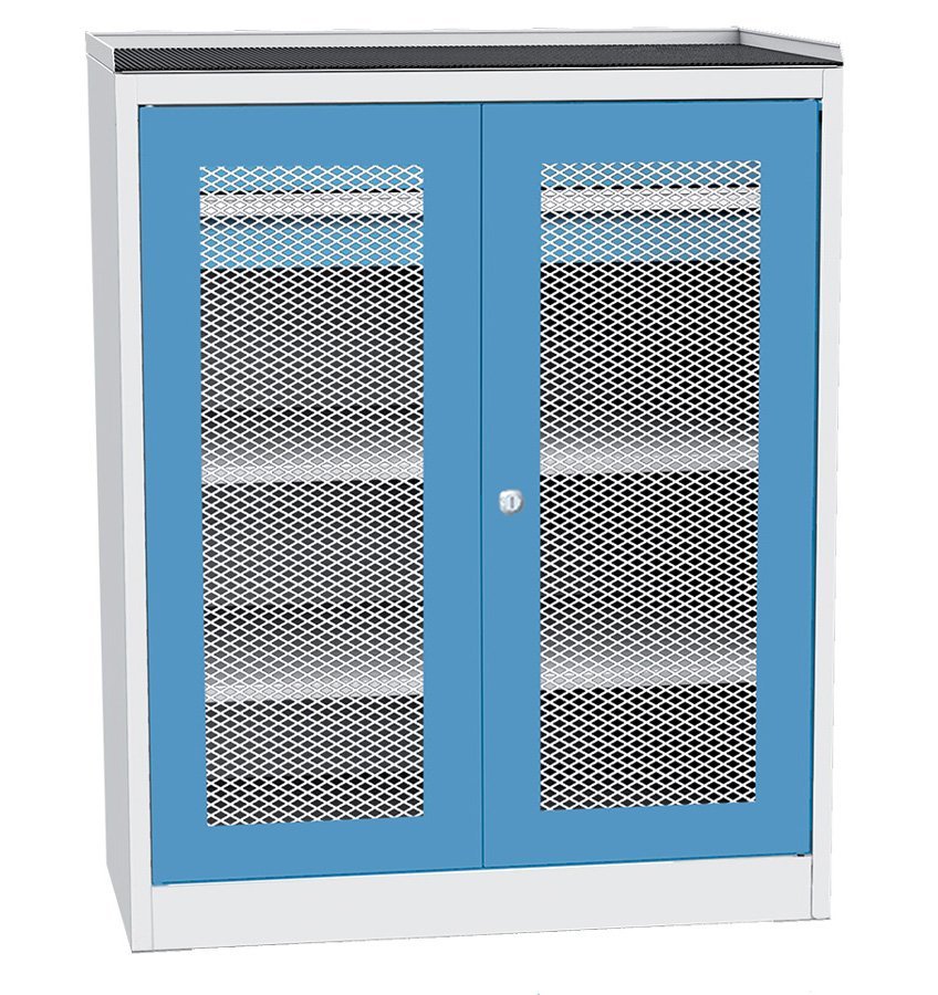 Szafa warsztatowa dwudrzwiowa z drzwiami drucianymi w ramie stalowej, szerokość 950, wysokość 1180, głębokość 600 mm, 2 półki, 2 szuflady. Nośność korpusu 800 kg, pojemność szuflady 50 kg, pojemność półki 100 kg. Kolor korpusu RAL 7035 jasnoszary.