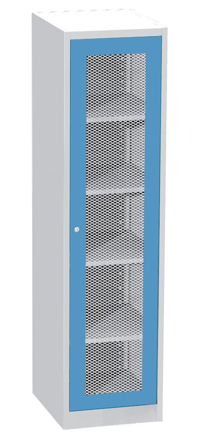 Jednodrzwiowa szafa warsztatowa z drzwiami drucianymi w ramie stalowej, szerokość 505, wysokość 1950, głębokość 600 mm, 4 półki. Nośność korpusu 800 kg, pojemność półki 100 kg. Kolor korpusu RAL 7035 jasnoszary.