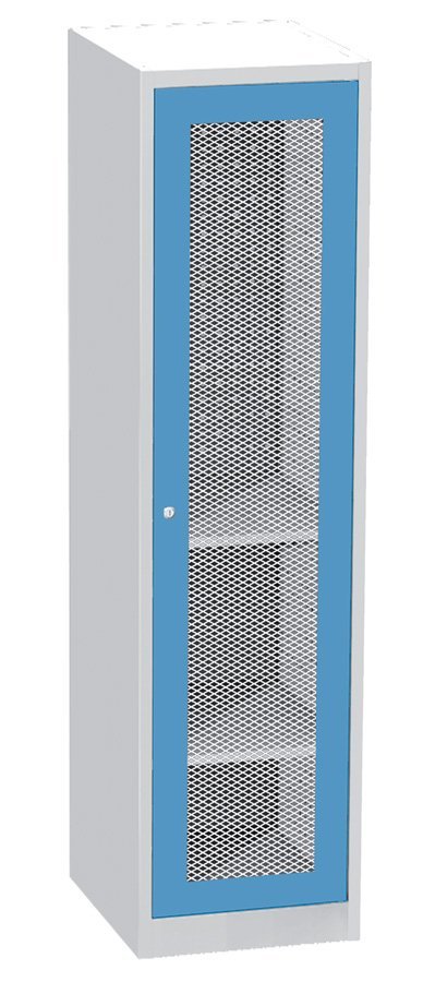 Jednodrzwiowa szafa warsztatowa z drzwiami drucianymi w ramie stalowej, szerokość 505, wysokość 1950, głębokość 600 mm, 2 półki. Nośność korpusu 800 kg, pojemność półki 100 kg. Kolor korpusu RAL 7035 jasnoszary.