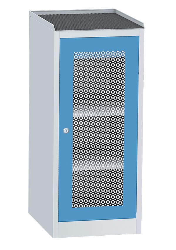 Szafa warsztatowa jednodrzwiowa, szerokość 505, wysokość 1950, głębokość 600 mm, 2 półki. Możliwość wymiany drzwi pełnych na ramę ze szkła hartowanego lub siatki drucianej dla lepszego przeglądu zawartości szafki. Nośność korpusu 800 kg, pojemność półki 100 kg. Kolor korpusu RAL 7035 jasnoszary.