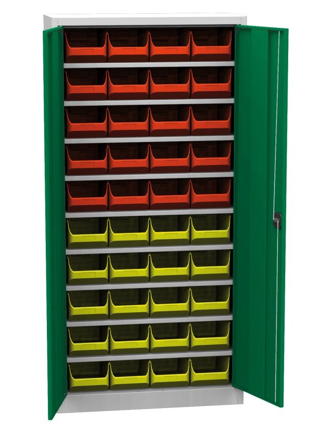 Szafa warsztatowa dwudrzwiowa, szerokość 950, wysokość 1950, głębokość 400 mm. 9 półek. Możliwość wymiany drzwi pełnych na drzwi z wypełnieniem szklanym lub drucianym. Kolor korpusu RAL 7035 jasnoszary.