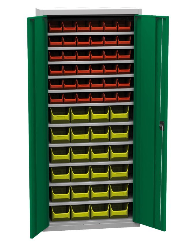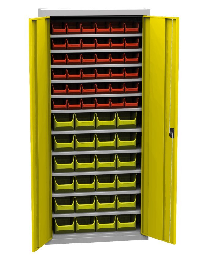 Szafa warsztatowa dwudrzwiowa ze skrzynkami plastikowymi (34), szerokość 950, wysokość 800, głębokość 400 mm. 4x półki, 24x plastikowe pudełko 456231 (szer. 102 x wys. 75 x gł. 215 mm), 10x plastikowe pudełko 456210 (szer. 150 x wys. 125 x gł. 235 mm). Możliwość wymiany drzwi pełnych na drzwi z wypełnieniem szklanym lub drucianym.