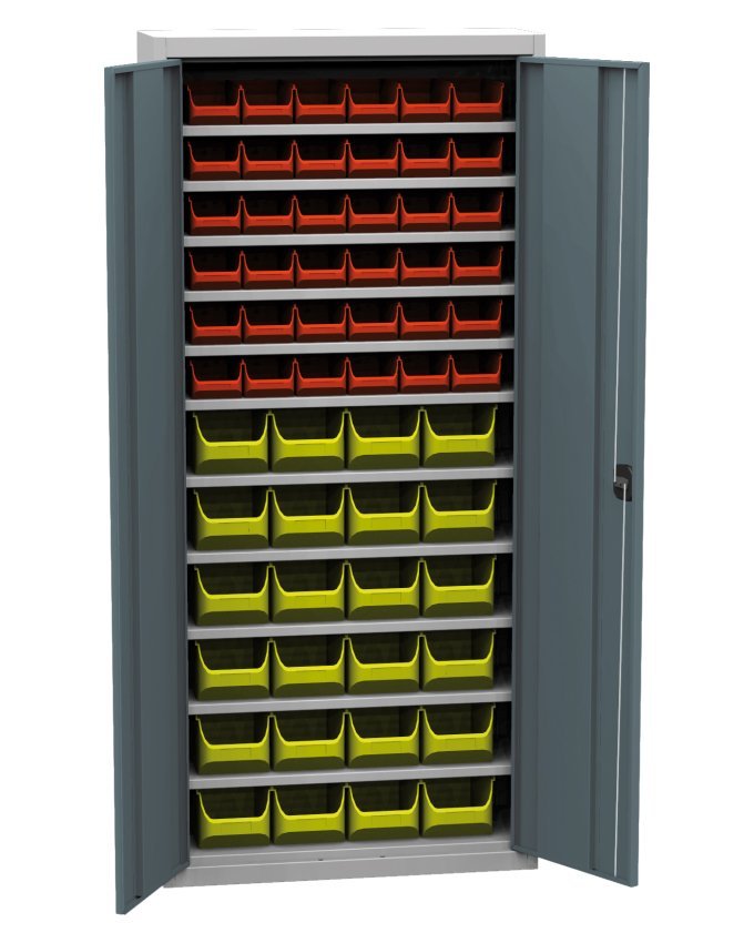 Szafa warsztatowa dwudrzwiowa ze skrzynkami plastikowymi (60), szerokość 750, wysokość 1650, głębokość 300 mm. 11x półki, 36x plastikowe pudełko małe (szer. 110 x wys. 75 x gł. 165 mm), 24 x plastikowe pudełko średnie (szer. 155 x wys. 125 x gł. 240 mm). Możliwość wymiany drzwi pełnych na drzwi z wypełnieniem szklanym lub drucianym. Na stanie w jasnoszarym korpusie, niebieskich pełnych drzwiach oraz niebieskich i czerwonych skrzynkach.