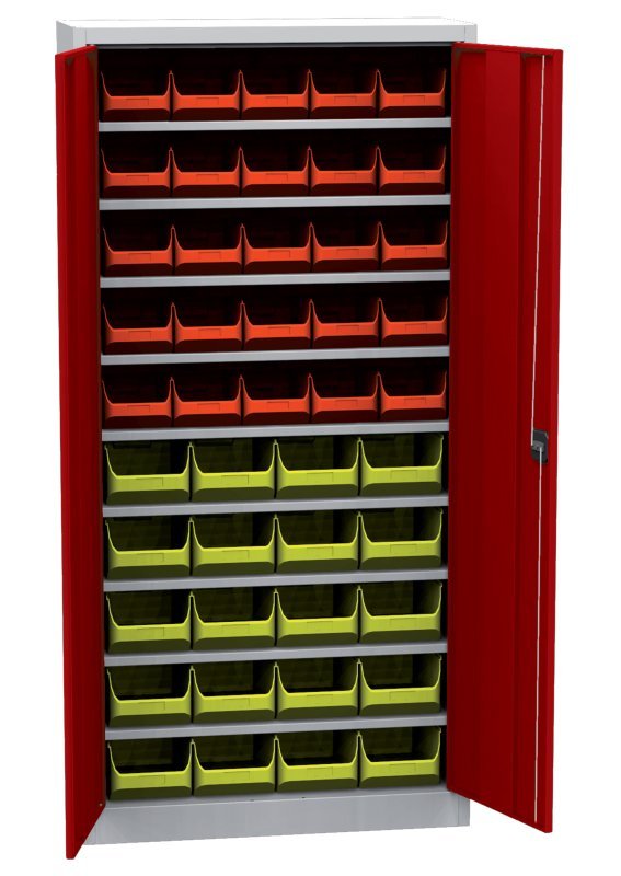 Szafa warsztatowa dwudrzwiowa ze skrzynkami plastikowymi (34), szerokość 950, wysokość 800, głębokość 400 mm. 4x półki, 24x plastikowe pudełko 456231 (szer. 102 x wys. 75 x gł. 215 mm), 10x plastikowe pudełko 456210 (szer. 150 x wys. 125 x gł. 235 mm). Możliwość wymiany drzwi pełnych na drzwi z wypełnieniem szklanym lub drucianym.