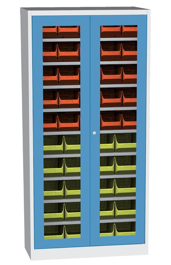 Szafa warsztatowa dwudrzwiowa, szerokość 950, wysokość 1950, głębokość 400 mm. 9 półek. Drzwi szklane w ramie stalowej. Kolor korpusu RAL 7035 jasnoszary.
