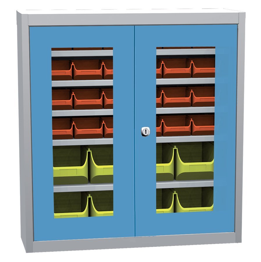 Szafa warsztatowa dwudrzwiowa, szerokość 750, wysokość 800, głębokość 300 mm. 5x półki. Drzwi szklane w ramie stalowej. Kolor pełny opis i parametry