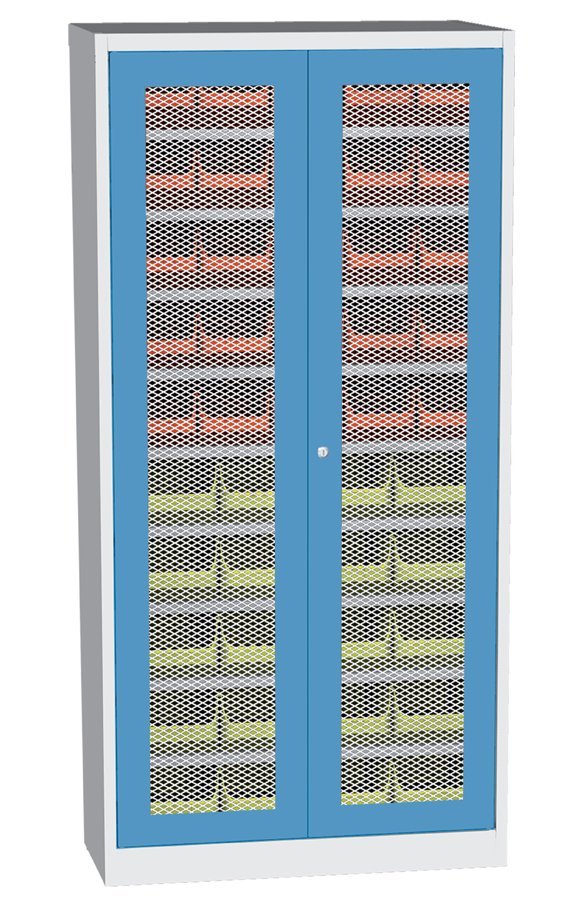 Szafa warsztatowa dwudrzwiowa ze skrzynkami plastikowymi (60), szerokość 750, wysokość 1650, głębokość 300 mm. 11x półki, 36x plastikowe pudełko małe (szer. 110 x wys. 75 x gł. 165 mm), 24 x plastikowe pudełko średnie (szer. 155 x wys. 125 x gł. 240 mm). Możliwość wymiany drzwi pełnych na drzwi z wypełnieniem szklanym lub drucianym. Na stanie w jasnoszarym korpusie, niebieskich pełnych drzwiach oraz niebieskich i czerwonych skrzynkach.