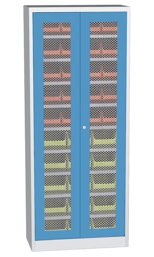 Szafa warsztatowa dwudrzwiowa, szerokość 800, wysokość 1950, głębokość 400 mm. 9 półek. Drzwi druciane w ramie stalowej. Kolor korpusu RAL 7035 jasnoszary.