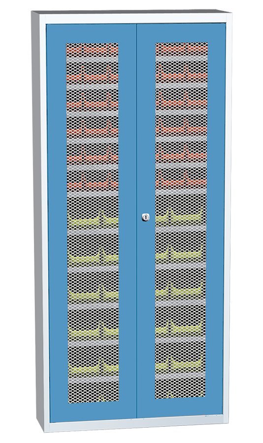Szafa warsztatowa dwudrzwiowa ze skrzynkami plastikowymi (60), szerokość 750, wysokość 1650, głębokość 300 mm. 11 x półki, 36 x plastikowe pudełko 456205 (szer. 75 x wys. 102 x gł. 160 mm), 24 x plastikowe pudełko 456242 (szer. 82 x wys. 137 x gł. 160 mm). Drzwi druciane w ramie stalowej. Kolor korpusu RAL 7035 jasnoszary.