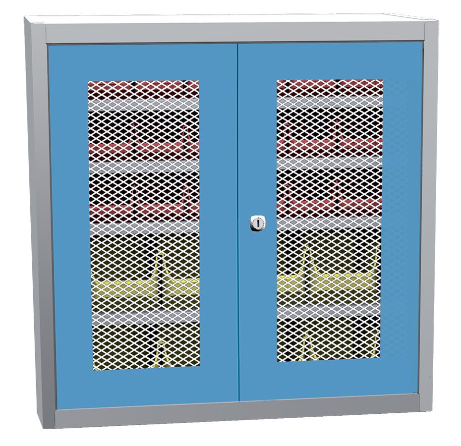 Szafa warsztatowa dwudrzwiowa, szerokość 800, wysokość 800, głębokość 400 mm. 4x półki. Drzwi druciane w ramie stalowej. Kolor korpusu RAL 7035 jasnoszary.