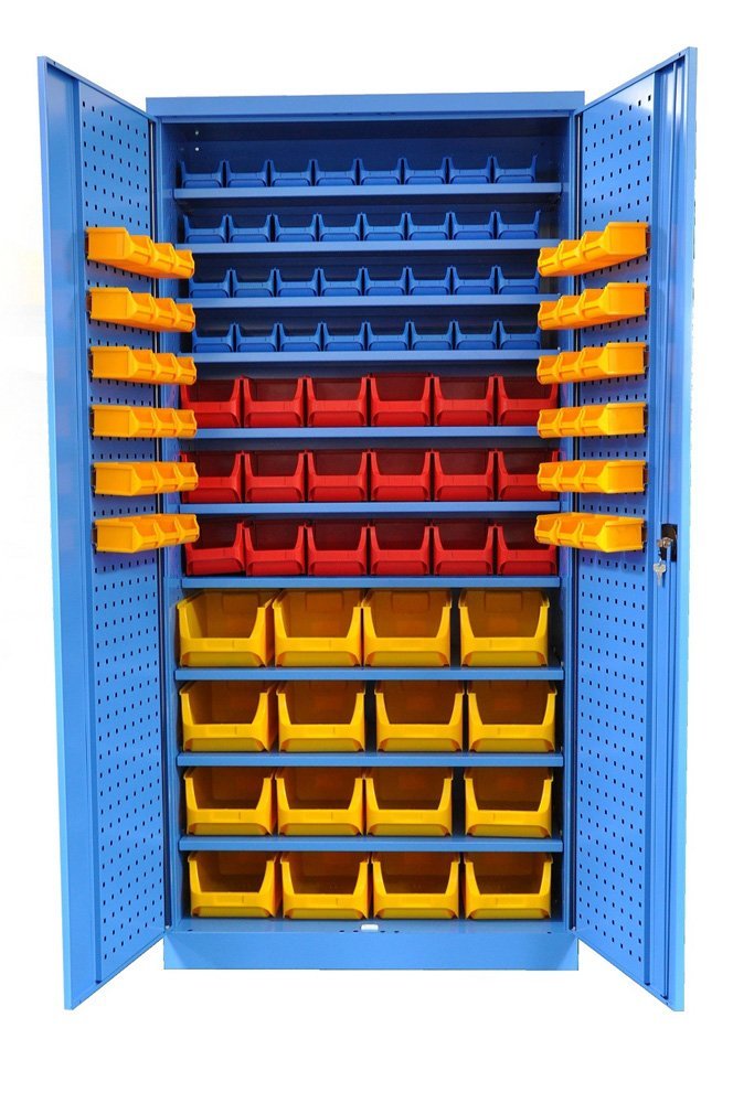Szafa warsztatowa z plastikowymi pojemnikami. Wysokość 1950 x szerokość 950 x głębokość 400 mm. Więcej informacji na temat pudełek plastikowych w całym opisie (patrz menu po lewej stronie). Dostępny w kolorze szafki RAL 5012 niebieski.