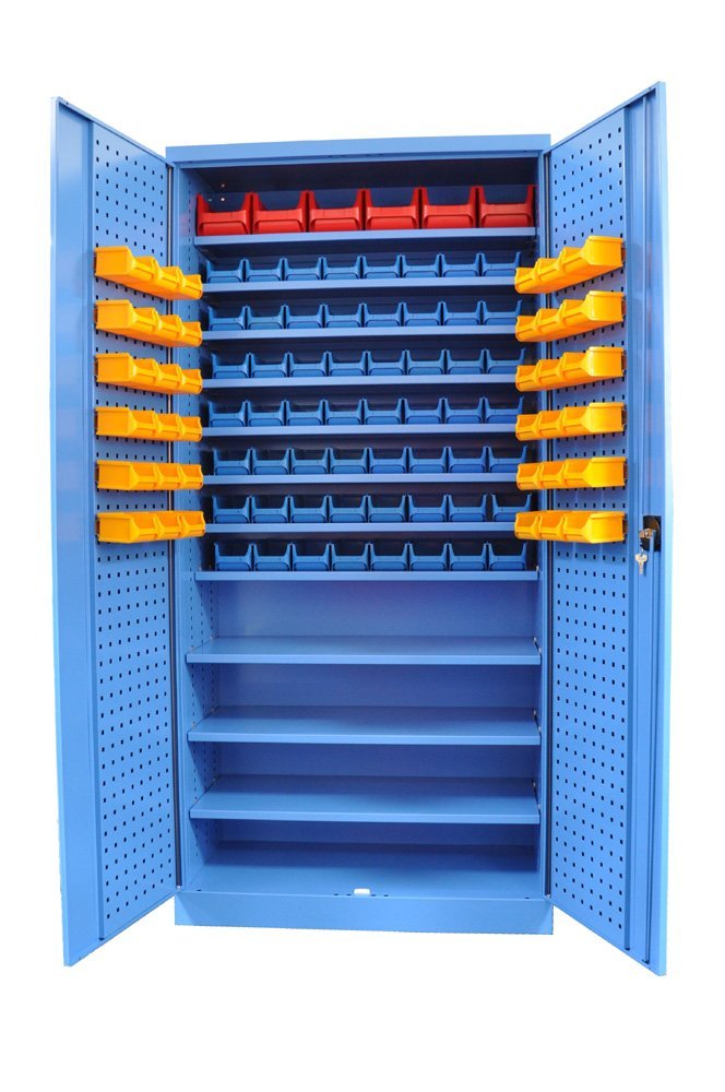 Szafa warsztatowa z plastikowymi pojemnikami. Wysokość 1950 x szerokość 950 x głębokość 400 mm. Więcej informacji na temat pudełek plastikowych w całym opisie (patrz menu po lewej stronie). Dostępny w kolorze szafki RAL 5012 niebieski.