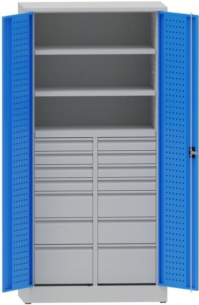 Szafa warsztatowa dwudrzwiowa, drzwi perforowane. Wysokość 1950 x szerokość 950 x głębokość 500 mm. Zamek trzypunktowy, 14 szuflad, 2 półki. Kolor korpusu RAL 7035 jasnoszary, drzwi RAL 7035 jasnoszary lub RAL 5012 niebieski.