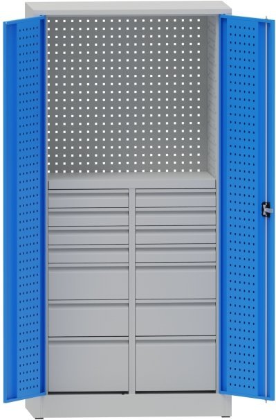 Ekonomiczna dwudrzwiowa szafa warsztatowa z panelami perforowanymi. Wysokość 1950 x szerokość 950 x głębokość 500 mm. Zamek trzypunktowy rozstawu osi, 3 półki regulowane, 10 szuflad (wysuw 90%). Kolor korpusu RAL 7035 jasnoszary, drzwi RAL 7035 jasnoszary, RAL 5005 niebieski i RAL 5012 niebieski.