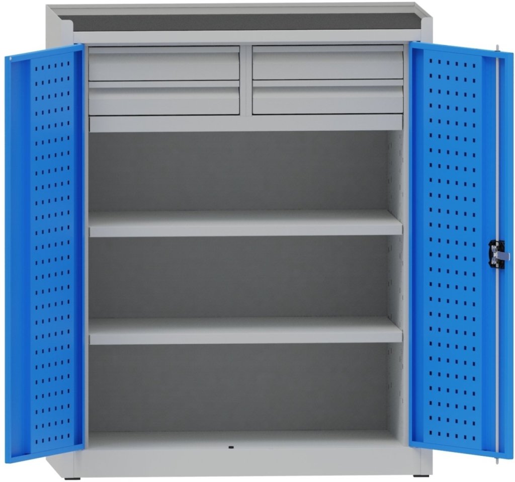Szafa warsztatowa dwudrzwiowa, drzwi perforowane. Wysokość 1170 x szerokość 950 x głębokość 500 mm. Zamek trzypunktowy rozstawu osi, 2x półki, 4x szuflady. Kolor korpusu RAL 7035 jasnoszary, drzwi RAL 7035 jasnoszary lub RAL 5012 niebieski.