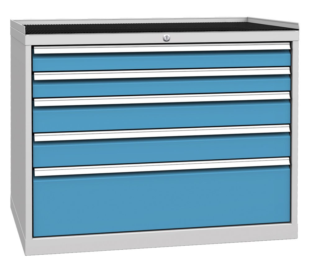 Szafa warsztatowa z pięcioma szufladami, szerokość 1000, wysokość 840, głębokość 700 mm. Wysuw szuflady 80%, nośność szuflady 80 kg, zamek centralny. 2x nasadka 90, 2x 120, 1x 240 mm. Kolor korpusu RAL 7035 jasnoszary.