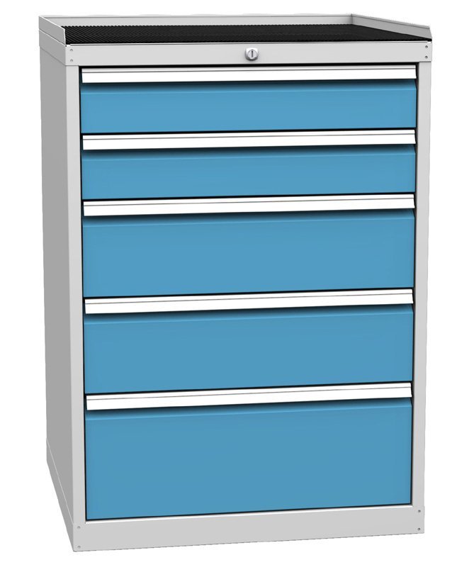 Szafa warsztatowa z pięcioma szufladami, szerokość 720, wysokość 840, głębokość 700 mm. Wysuw szuflady 80%, nośność szuflady 80 kg, zamek centralny. 1x szuflada 60, 1x 90, 1x 120, 1x 180, 1x 210 mm. Kolor korpusu RAL 7035 jasnoszary.