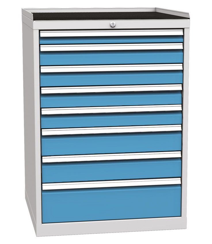 Szafa warsztatowa z ośmioma szufladami, szerokość 720, wysokość 1350, głębokość 700 mm. Wysuw szuflady 80%, nośność szuflady 80 kg, zamek centralny. 1x szuflada 60, 2x 90, 1x 120, 1x 150. 1x 180, 1x 210, 1x 240 mm. Kolor korpusu RAL 7035 jasnoszary.