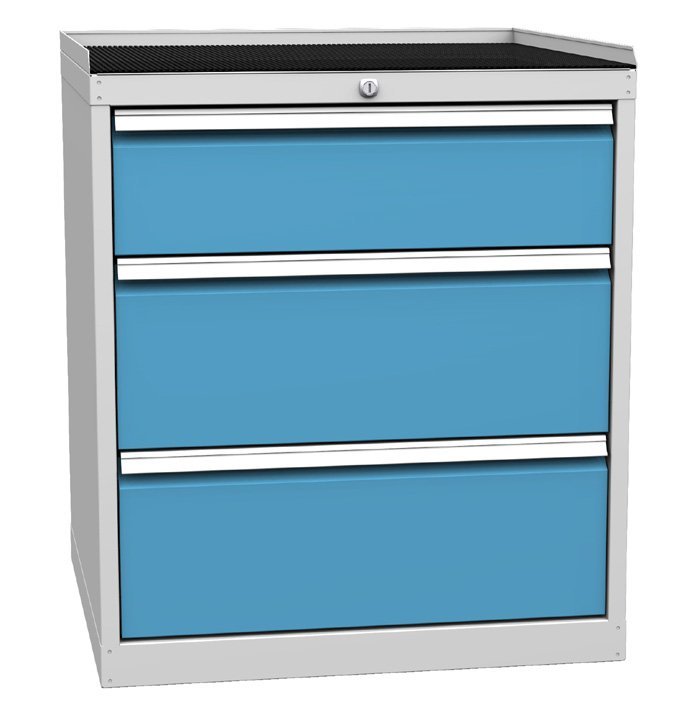 Szafa warsztatowa z trzema szufladami, szerokość 720, wysokość 840, głębokość 700 mm. Wysuw szuflady 80%, nośność szuflady 80 kg, zamek centralny. 1x nasadka 180, 2x 240 mm. Kolor korpusu RAL 7035 jasnoszary.