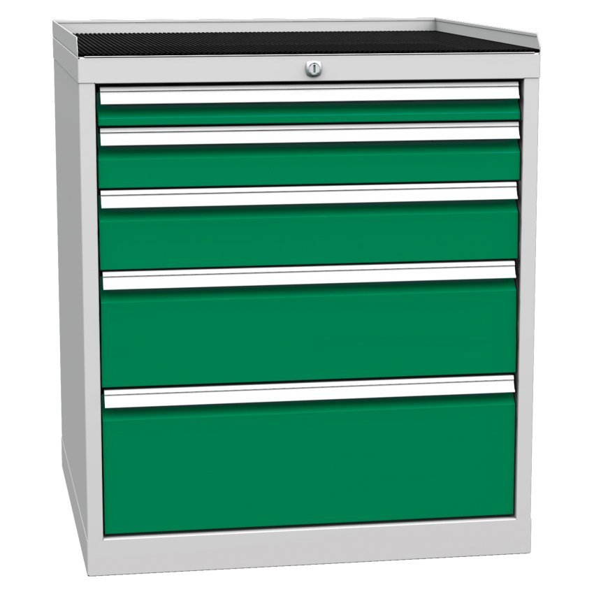 Szafa warsztatowa z pięcioma szufladami, szerokość 720, wysokość 840, głębokość 700 mm. Wysuw szuflady 80%, nośność szuflady 80 kg, zamek centralny. 1x szuflada 60, 1x 90, 1x 120, 1x 180, 1x 210 mm. Kolor korpusu RAL 7035 jasnoszary.