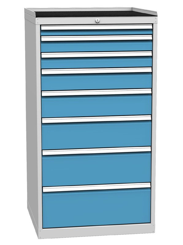 Szafa warsztatowa z ośmioma szufladami, szerokość 720, wysokość 1350, głębokość 700 mm. Wysuw szuflady 80%, nośność szuflady 80 kg, zamek centralny. 1x szuflada 60, 2x 90, 1x 120, 1x 150. 1x 180, 1x 210, 1x 240 mm. Kolor korpusu RAL 7035 jasnoszary.
