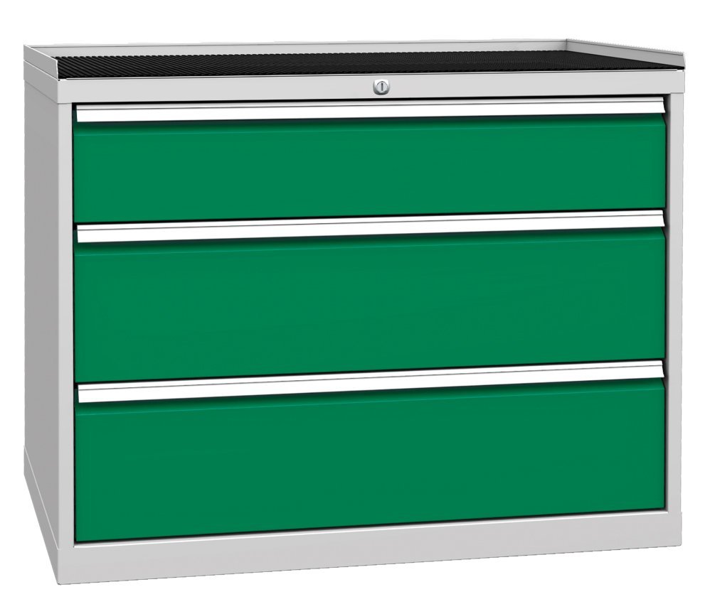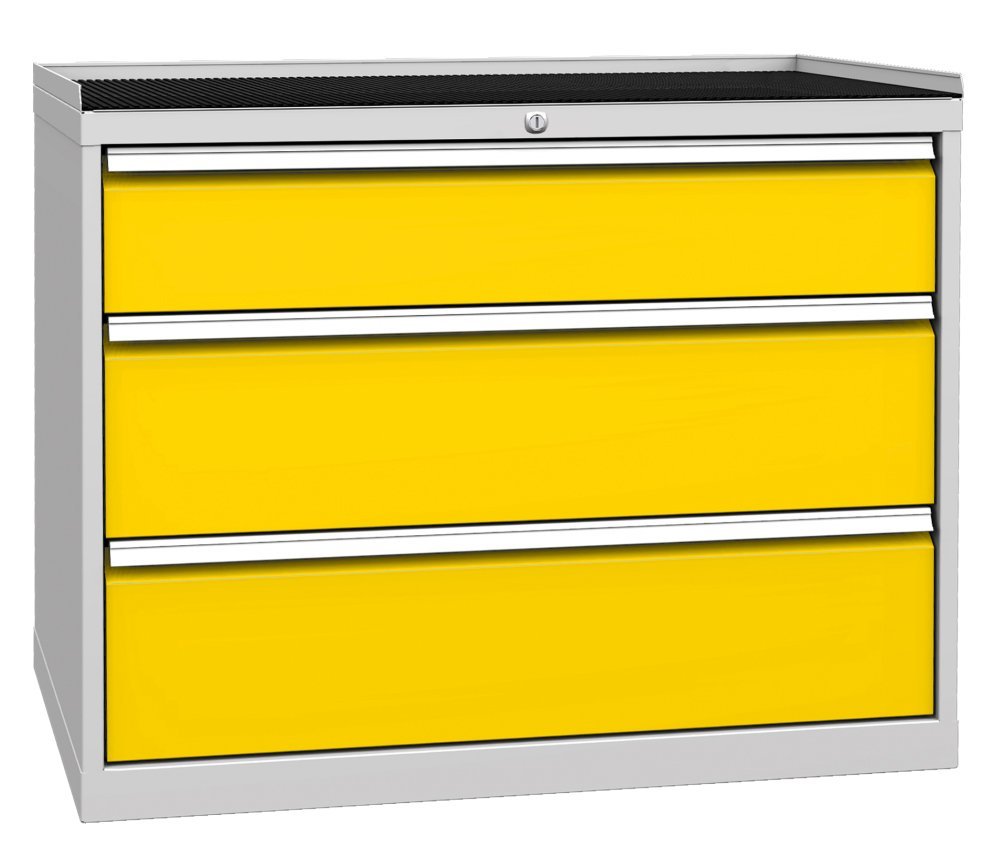 Szafa warsztatowa z trzema szufladami, szerokość 1000, wysokość 840, głębokość 700 mm. Wysuw szuflady 80%, nośność szuflady 80 kg, zamek centralny. 1x nasadka 180, 2x 240 mm. Kolor korpusu RAL 7035 jasnoszary.