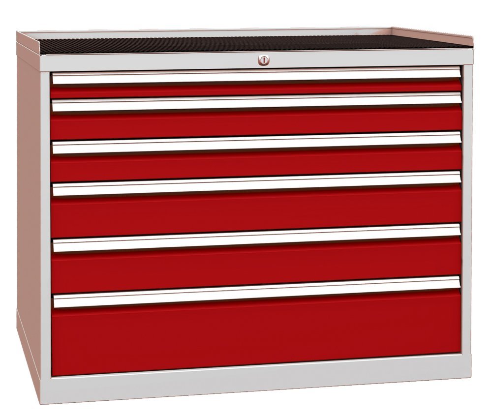 Szafa warsztatowa z sześcioma szufladami, szerokość 1000, wysokość 1030, głębokość 700 mm. Wysuw szuflady 80%, nośność szuflady 80 kg, zamek centralny. 1x szuflada 60, 1x 90, 1x 120, 1x 150, 1x 180, 1x 240 mm. Kolor korpusu RAL 7035 jasnoszary.