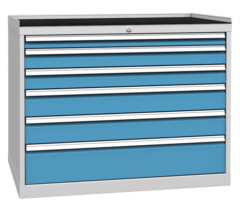 Szafa warsztatowa z sześcioma szufladami, szerokość 720, wysokość 1030, głębokość 700 mm. Wysuw szuflady 80%, nośność szuflady 80 kg, zamek centralny. 1x szuflada 60, 2x 90, 2x 180, 1x 240 mm. Kolor korpusu RAL 7035 jasnoszary. Na stanie jasnoszary korpus i niebieskie szuflady.