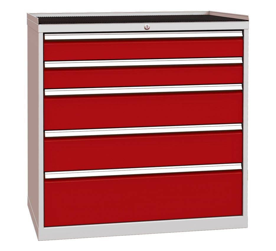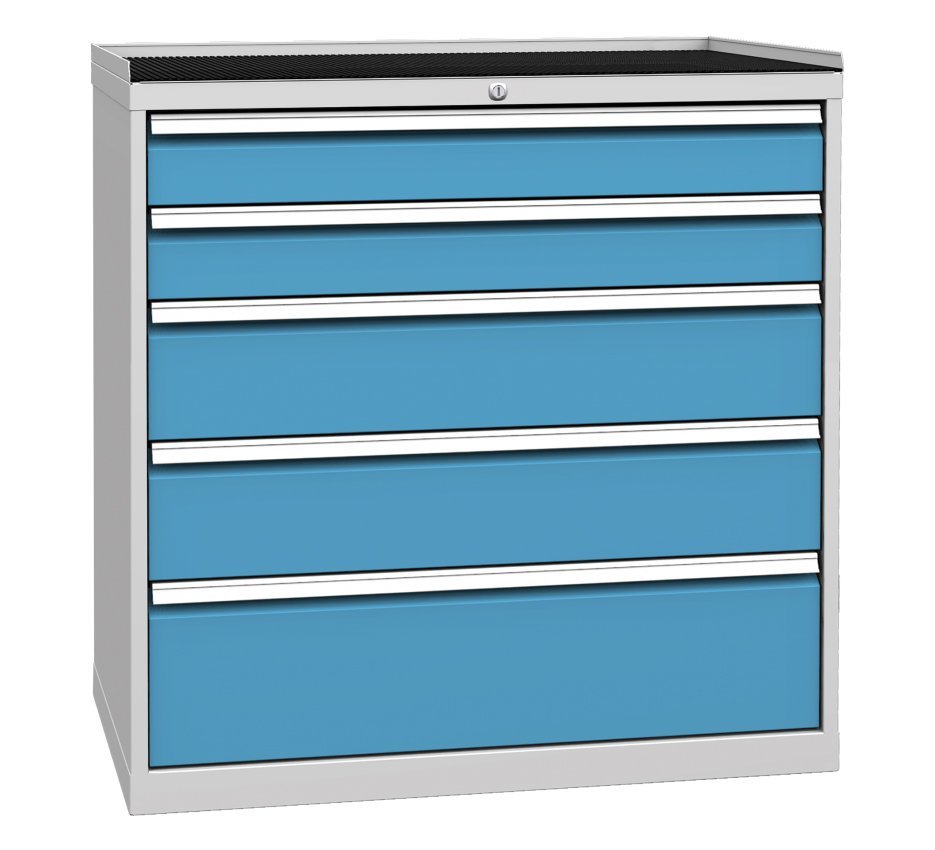 Szafa warsztatowa z pięcioma szufladami, szerokość 1000, wysokość 1030, głębokość 700 mm. Wysuw szuflady 80%, nośność szuflady 80 kg, zamek centralny. 2x nasadka 120, 2x 180, 1x 240 mm. Kolor korpusu RAL 7035 jasnoszary.