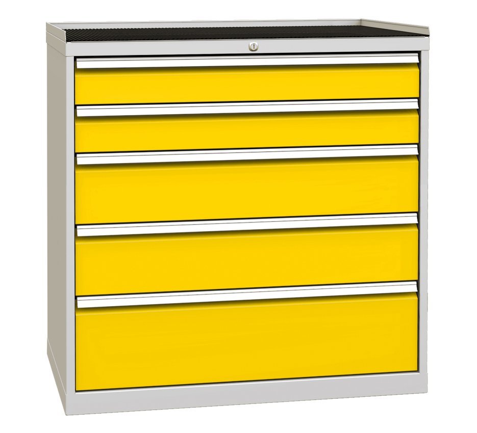 Szafa warsztatowa z pięcioma szufladami, szerokość 720, wysokość 840, głębokość 700 mm. Wysuw szuflady 80%, nośność szuflady 80 kg, zamek centralny. 1x szuflada 60, 1x 90, 1x 120, 1x 150, 1x 240 mm. Kolor korpusu RAL 7035 jasnoszary.