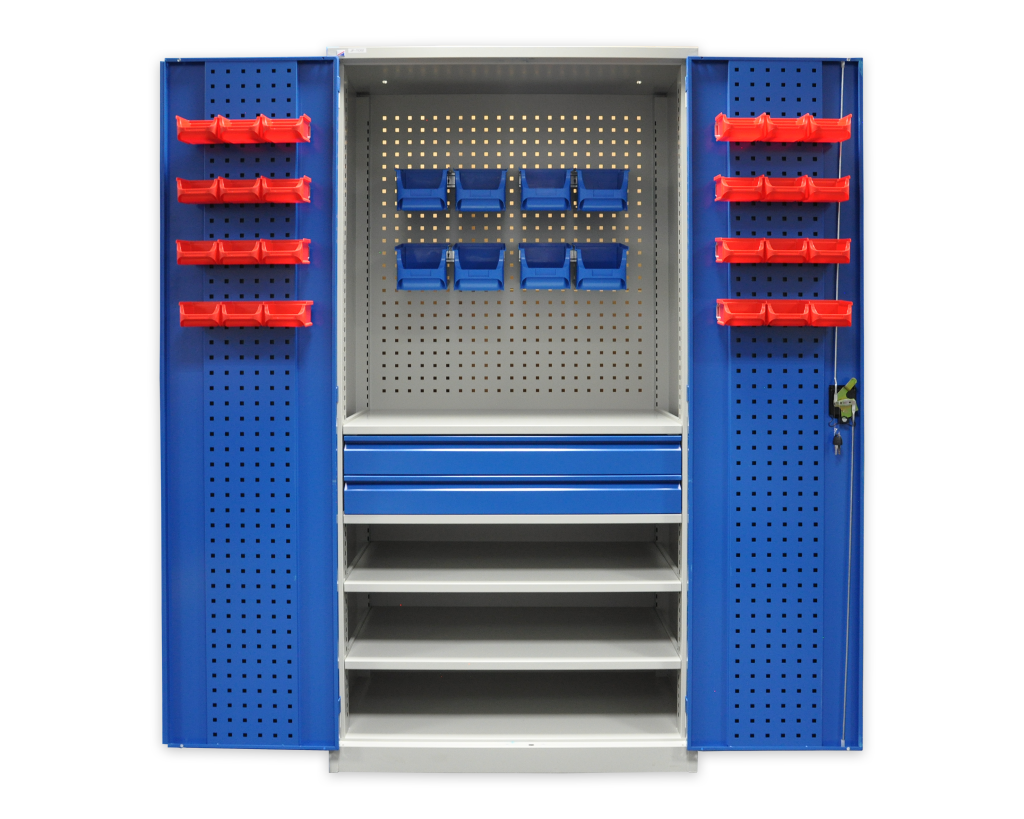 Ekonomiczna dwudrzwiowa szafa warsztatowa z panelami perforowanymi. Wysokość 1950 x szerokość 950 x głębokość 500 mm. Zamek trzypunktowy rozstawu osi, 3 półki regulowane, 10 szuflad (wysuw 90%). Kolor korpusu RAL 7035 jasnoszary, drzwi RAL 7035 jasnoszary, RAL 5005 niebieski i RAL 5012 niebieski.