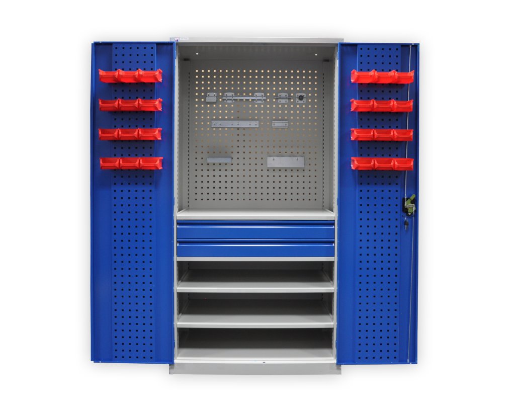 Ekonomiczna dwudrzwiowa szafa warsztatowa z panelami perforowanymi. Wysokość 1950 x szerokość 950 x głębokość 500 mm. Zamek trzypunktowy rozstawu osi, 3 półki regulowane, 10 szuflad (wysuw 90%). Kolor korpusu RAL 7035 jasnoszary, drzwi RAL 7035 jasnoszary, RAL 5005 niebieski i RAL 5012 niebieski.
