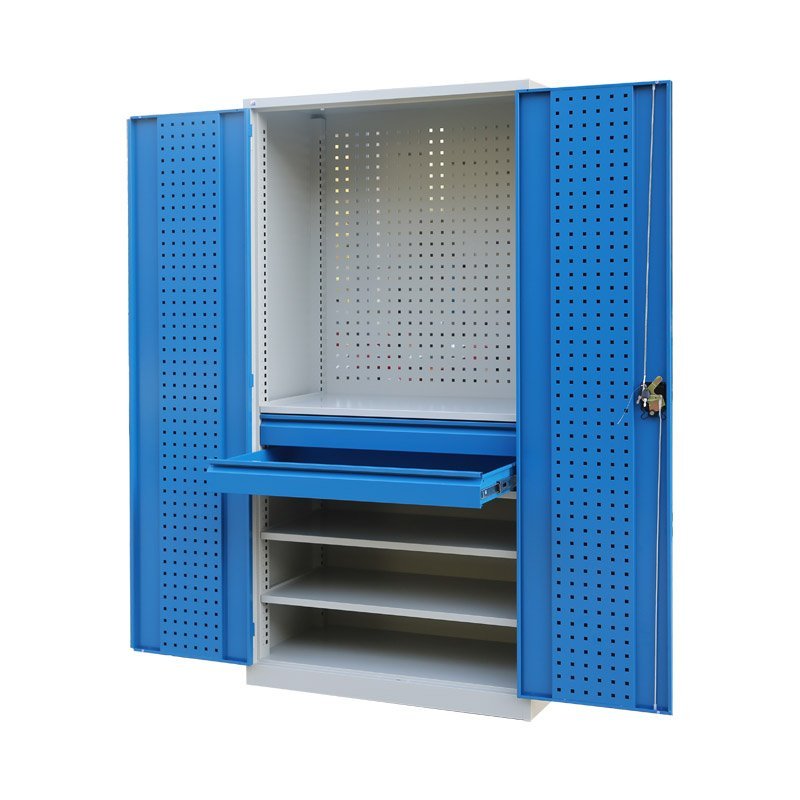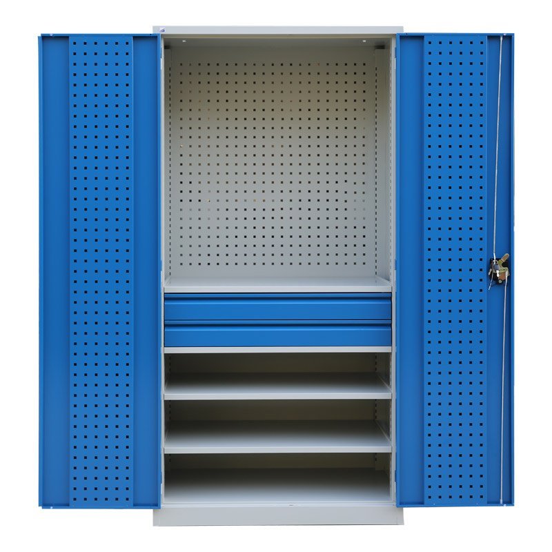 Ekonomiczna dwudrzwiowa szafa warsztatowa z panelami perforowanymi. Wysokość 1950 x szerokość 950 x głębokość 500 mm. Zamek trzypunktowy rozstawu osi, 3 półki regulowane, 3 szuflady (wysuw 90%). Kolor korpusu RAL 7035 jasnoszary, drzwi RAL 7035 jasnoszary, RAL 5005 niebieski i RAL 5012 niebieski. Na stanie jasnoszary korpus, niebieskie drzwi RAL 5012.