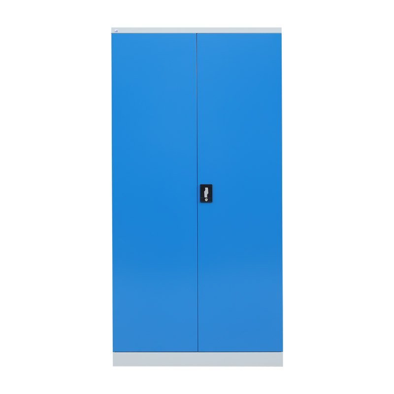 Szafa warsztatowa dwudrzwiowa, szerokość 950, wysokość 1180, głębokość 600 mm, 2 półki. Możliwość wymiany drzwi pełnych na ramę ze szkła hartowanego lub siatki drucianej dla lepszego przeglądu zawartości szafki. Nośność korpusu 800 kg, pojemność półki 100 kg. Kolor korpusu RAL 7035 jasnoszary. Na magazynie w wersji pełnej, kolor drzwi niebieski RAL 5012.