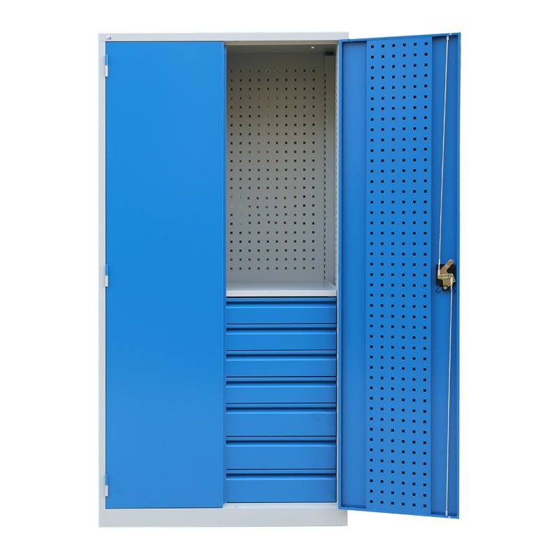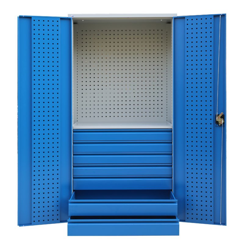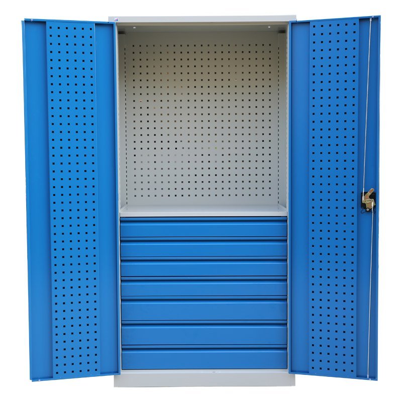 Ekonomiczna dwudrzwiowa szafa warsztatowa z panelami perforowanymi. Wysokość 1950 x szerokość 950 x głębokość 500 mm. Zamek trzypunktowy rozstawu osi, 3 półki z możliwością regulacji, 6 szuflad (wysuw 90%). Kolor korpusu RAL 7035 jasnoszary, drzwi RAL 7035 jasnoszary, RAL 5005 niebieski i RAL 5012 niebieski.