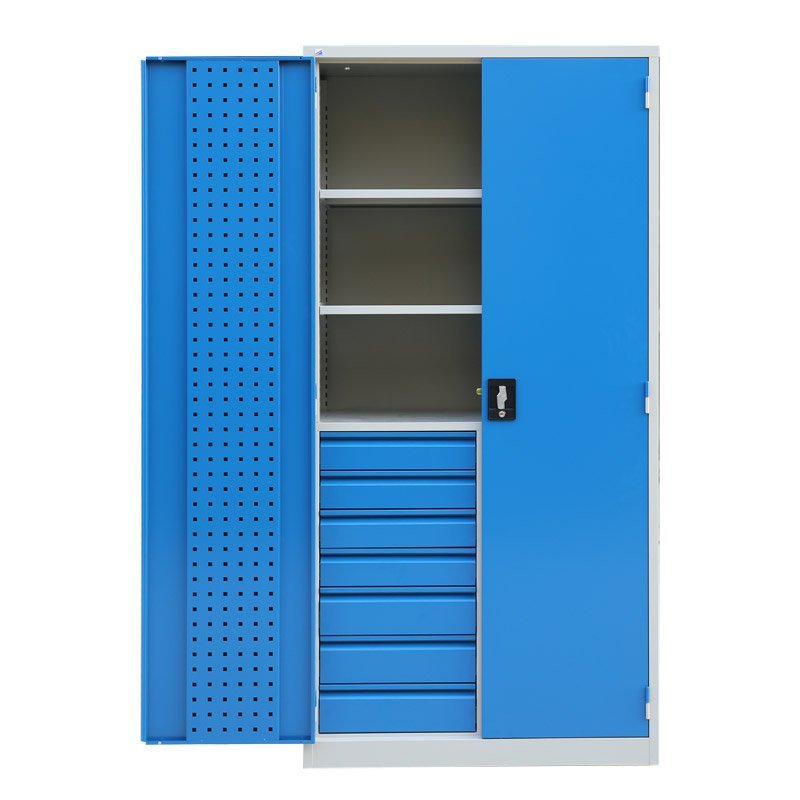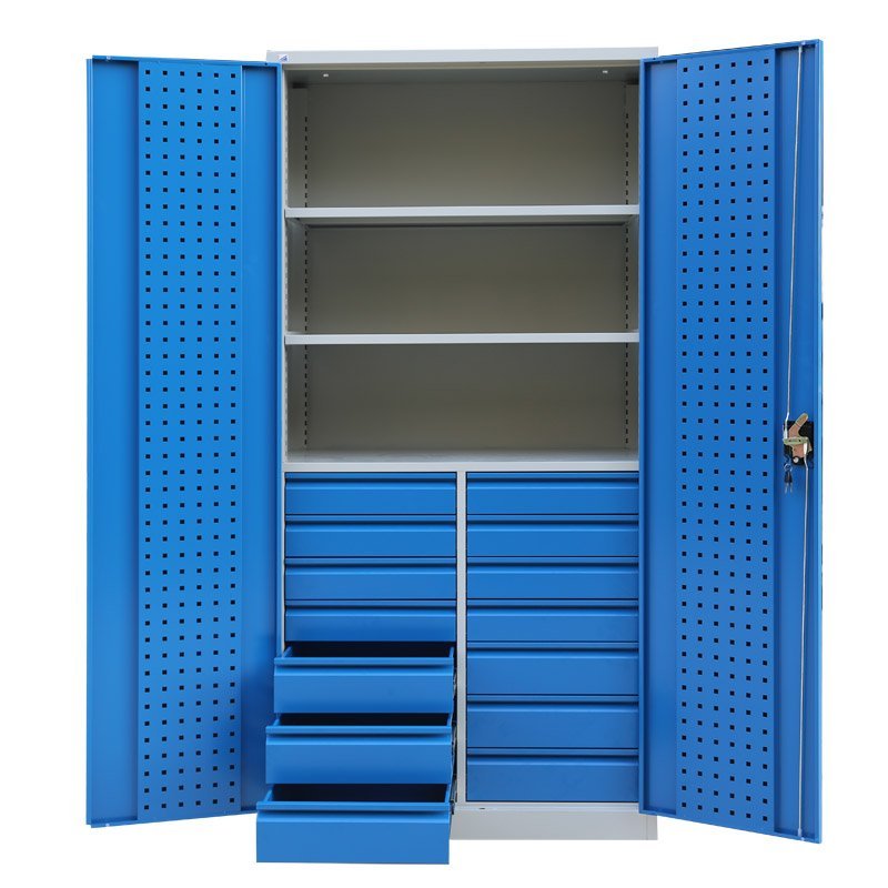 Ekonomiczna dwudrzwiowa szafa warsztatowa z panelami perforowanymi. Wysokość 1950 x szerokość 950 x głębokość 500 mm. Zamek trzypunktowy rozstawu osi, 3 półki regulowane, 10 szuflad (wysuw 90%). Kolor korpusu RAL 7035 jasnoszary, drzwi RAL 7035 jasnoszary, RAL 5005 niebieski i RAL 5012 niebieski.