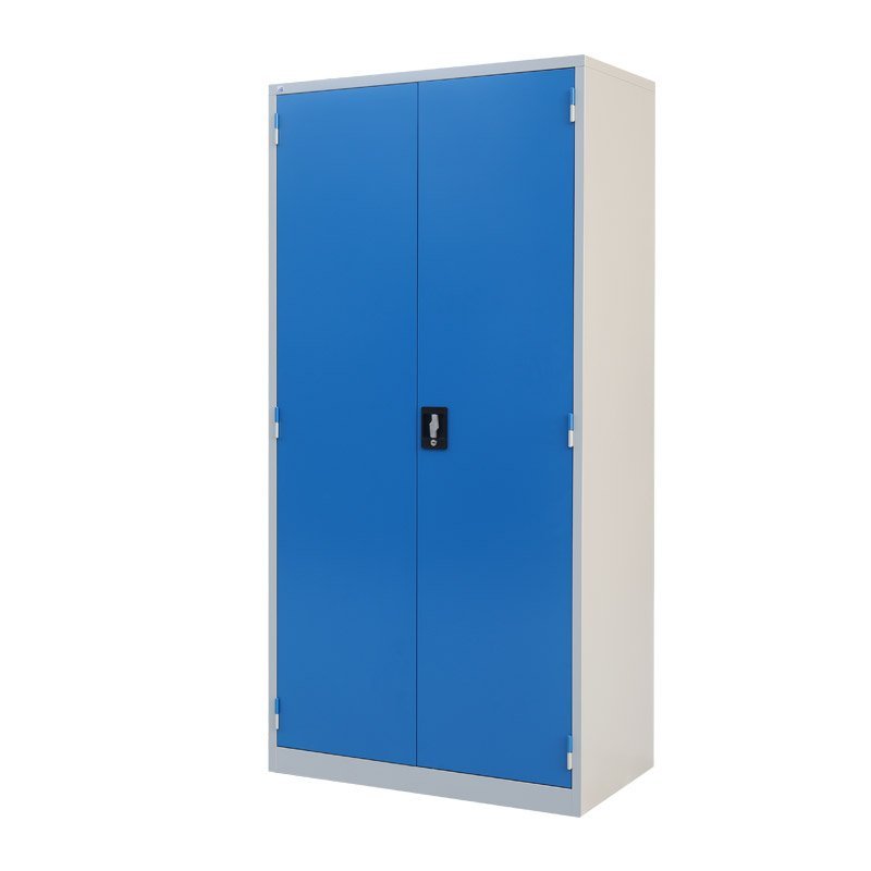 Szafa warsztatowa dwudrzwiowa, szerokość 950, wysokość 1180, głębokość 600 mm, 2 półki. Możliwość wymiany drzwi pełnych na ramę ze szkła hartowanego lub siatki drucianej dla lepszego przeglądu zawartości szafki. Nośność korpusu 800 kg, pojemność półki 100 kg. Kolor korpusu RAL 7035 jasnoszary. Na magazynie w wersji pełnej, kolor drzwi niebieski RAL 5012.