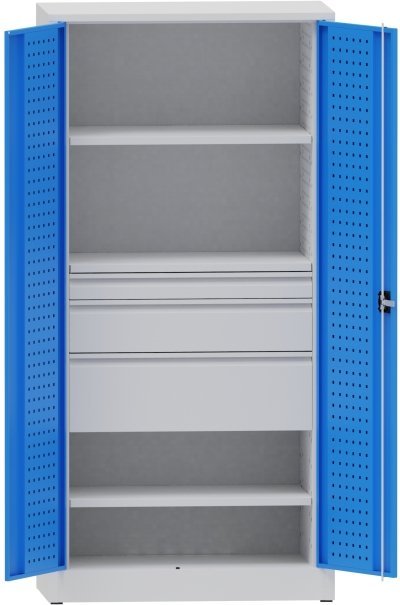Szafa warsztatowa dwudrzwiowa, drzwi perforowane. Wysokość 1950 x szerokość 950 x głębokość 500 mm. Zamek trzypunktowy, 2x półki, 3x szuflada. Kolor korpusu RAL 7035 jasnoszary, drzwi RAL 7035 jasnoszary lub RAL 5012 niebieski.