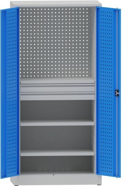 Dwudrzwiowa szafa warsztatowa, perforowany tył (górna połowa) i drzwi. Wysokość 1950 x szerokość 950 x głębokość 500 mm. Zamek trzypunktowy, 2x szuflada, 2x półki. Kolor korpusu RAL 7035 jasnoszary, drzwi RAL 7035 jasnoszary lub RAL 5012 niebieski.