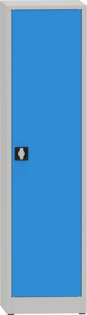 Szafa warsztatowa jednodrzwiowa, szerokość 505, wysokość 1950, głębokość 600 mm, 4 półki. Możliwość wymiany drzwi pełnych na ramę ze szkła hartowanego lub siatki drucianej dla lepszego przeglądu zawartości szafki. Nośność korpusu 800 kg, pojemność półki 100 kg. Kolor korpusu RAL 7035 jasnoszary. Na magazynie w wersji pełnej, kolor drzwi niebieski RAL 5012.