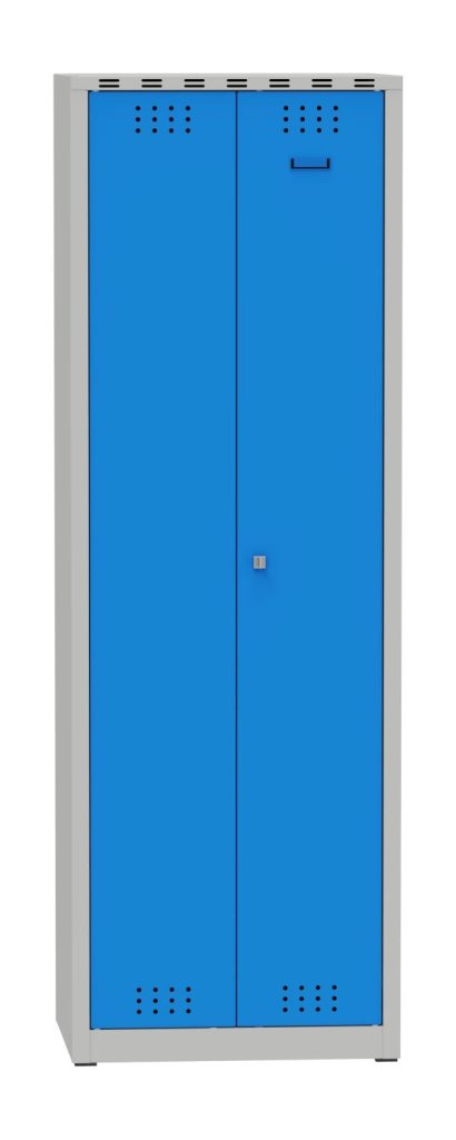 Duża szafka szatniowa z podwójnymi drzwiami, wysokość 1800 x szerokość 600 x głębokość 500 mm. Szafka wyposażona jest w 2 półki, drążek na wieszaki z przesuwanymi haczykami. Kolor korpusu RAL 7035 jasnoszary. Zamek bębenkowy lub zamknięcie na kłódkę