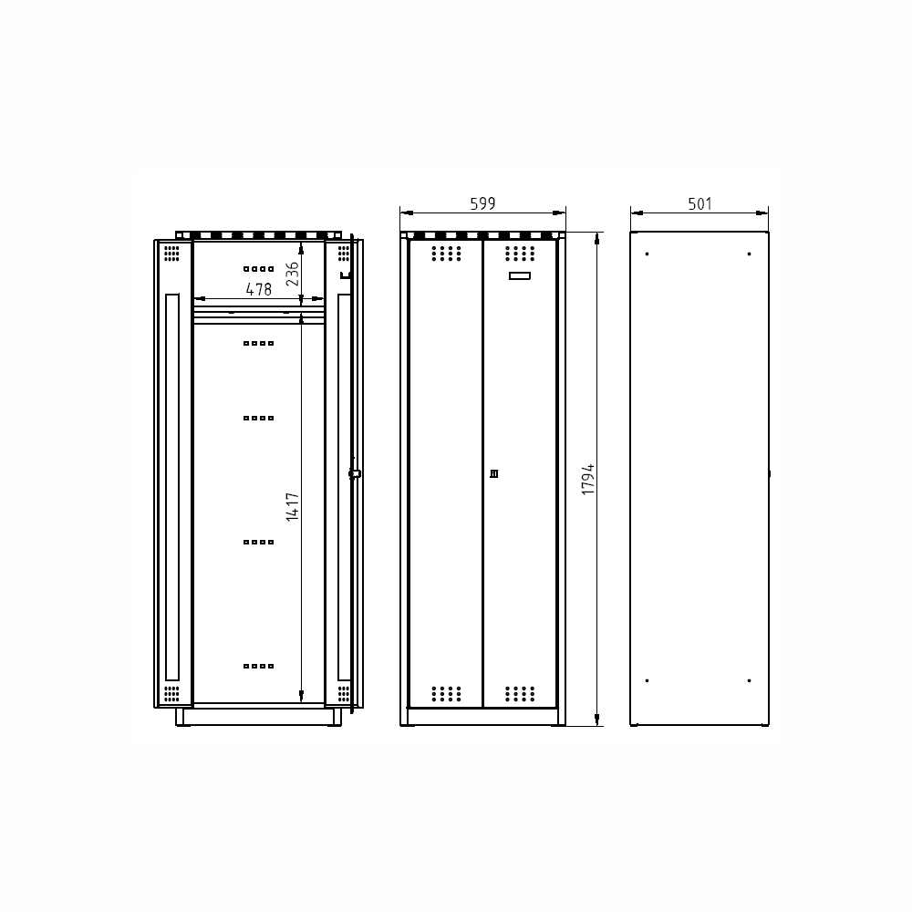 Duża szafa ze wspólnymi drzwiami, wysokość 1800 x szerokość 800 x głębokość 500 mm. Lewa połowa szafy wyposażona jest w półkę, drążek na wieszaki z wysuwanymi haczykami, prawa połowa w cztery półki. Kolor korpusu RAL 7035 jasnoszary.