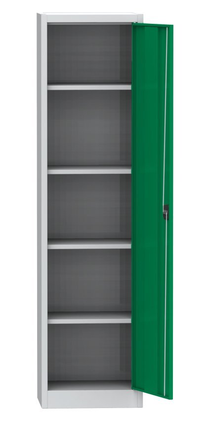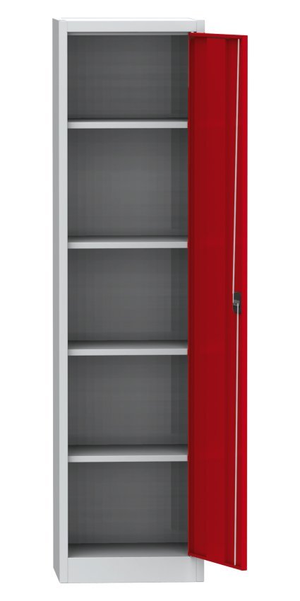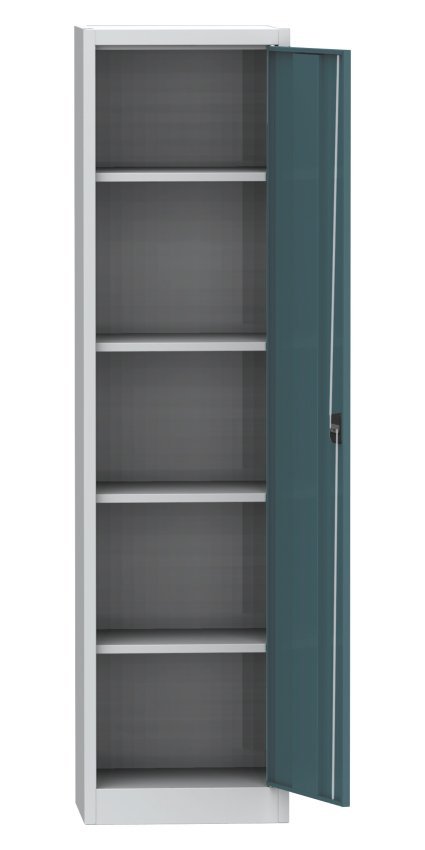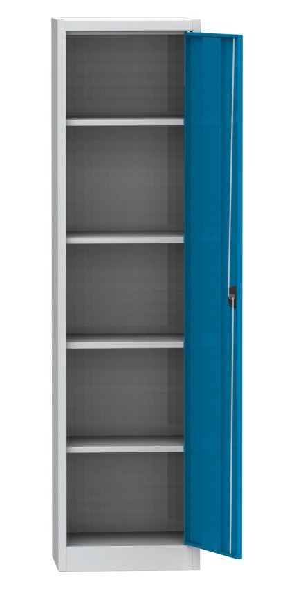Szafka z drzwiami pełnymi, wysokość 1150 x szerokość 505 x głębokość 400 mm. Ryglowanie na zamek bębenkowy z mechanizmem rozstawu osi. 2 x regulowane półki stalowe (nośność 60 kg). Możliwość wymiany drzwi pełnych na drzwi z wypełnieniem szklanym, z wypełnieniem drucianym lub drzwi laminowane w odcieniu buku, brzozy lub wiśni. Kolor korpusu RAL 7035 jasnoszary.