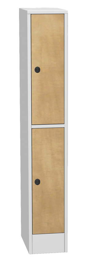 Szafka metalowa dwudrzwiowa dzielona, szerokość 300, wysokość 1850, głębokość 500 mm. Korpus metalowy w kolorze jasnoszarym RAL 7035, drzwi laminowane w kolorze buku, brzozy lub wiśni. Zamek bębenkowy z dwoma kluczami lub zamknięcie na kłódkę. Wyposażenie wewnętrzne każdego schowka - drążek z trzema przesuwanymi haczykami.